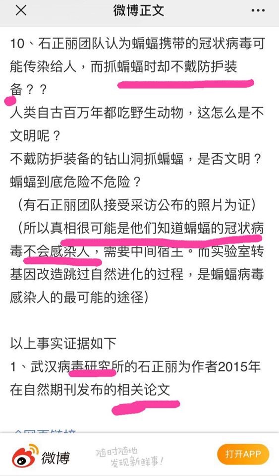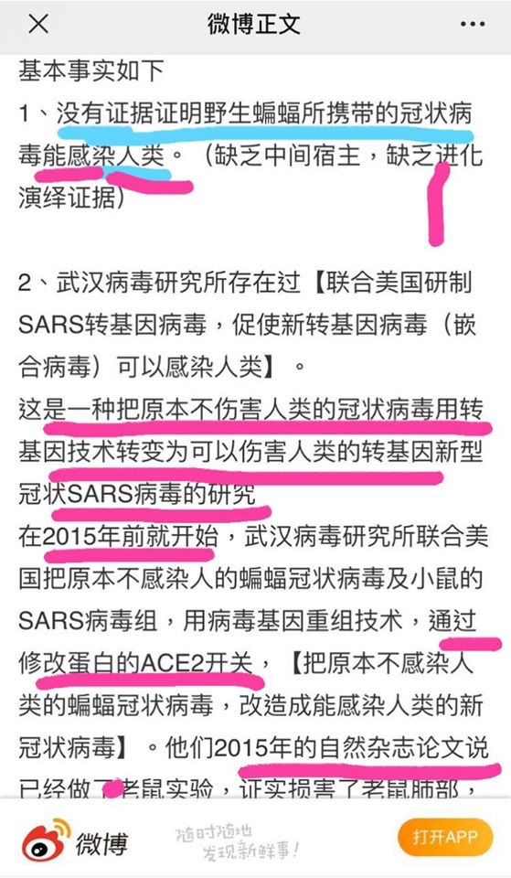 生死存亡之際,有人實名揭露真相。他提出正在威脅世界的、哈佛教授認為毒性史無前例的武漢冠狀病毒,是武漢病毒研究所,把蝙蝠身上並不感染人的病毒,改變成可以感染人的特別病毒。根據它們發布的論文,可以感覺到明顯的生物武器用途研究。