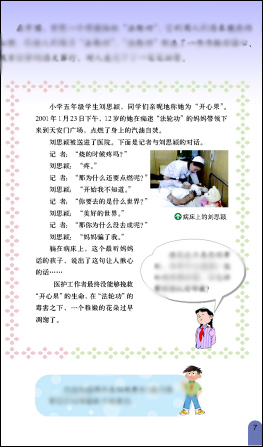 在人教版六年级上册《品德与社会》第7页,小女孩刘思影,被用来攻击法轮功。可是,专家分析显示,12岁的思影作为一个孩子,在伤后四天就带着插管声音清晰的接受采访,不惊不怕,还有兴致唱歌,完全违背基本医学常识!
