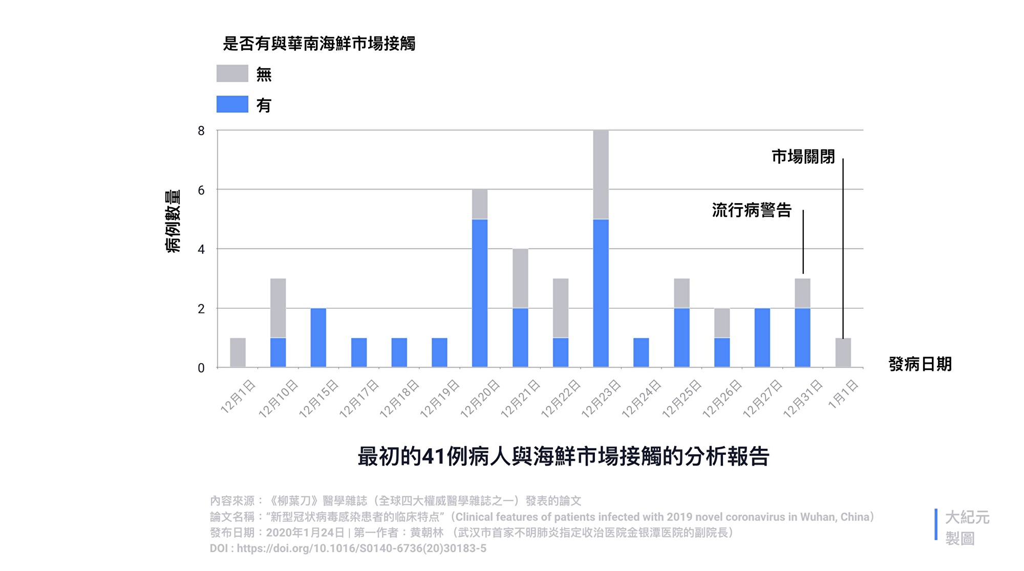 # 論文統計總共41例病人,有14例證實與海鮮市場無關聯,比例超過1/3。