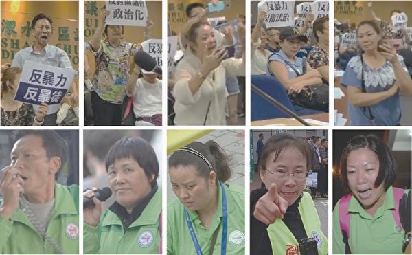 7月19日,深水埗区议会会议遭数十人滋扰而流会,当日滋事者(上排)被发现包括多名青关会骨干及成员,左起为陈进宝、张柳清、肖小蓉、关东焕、沈玲。他们过去都涉及滋扰法轮功学员的暴力事件。(大纪元制图)