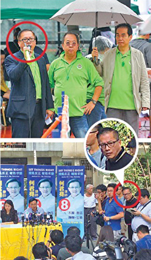 青关会会长杨江曾为何君尧在选举中助选。(大纪元制图)
