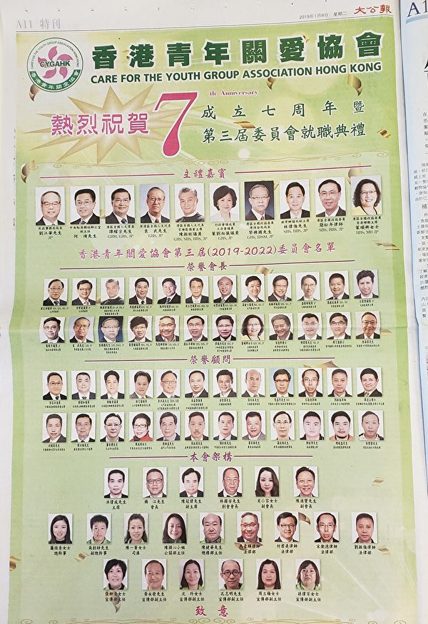 中共喉舌《大公报》今年1月8日A11特刊刊登的《香港青年关爱协会成立七周年暨第三届委员会就职典礼》广告,令香港众多高官名人的“青关会”身份曝光。(夏莉/大纪元)