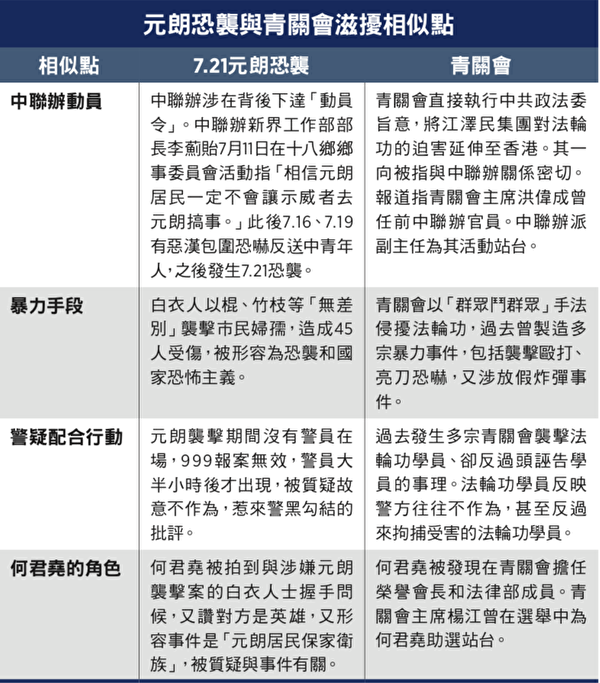 7‧21元朗恐袭与青关会滋扰的相似之处。(大纪元制图)