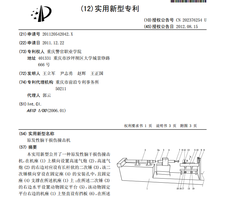 2011年12月以王立军作为领衔发明人(发明人是王立军、尹志勇、赵辉、王正国)申请专利“原发性脑干损伤撞击机”(专利号:CN201120542042),并于次年获此专利(图1)。